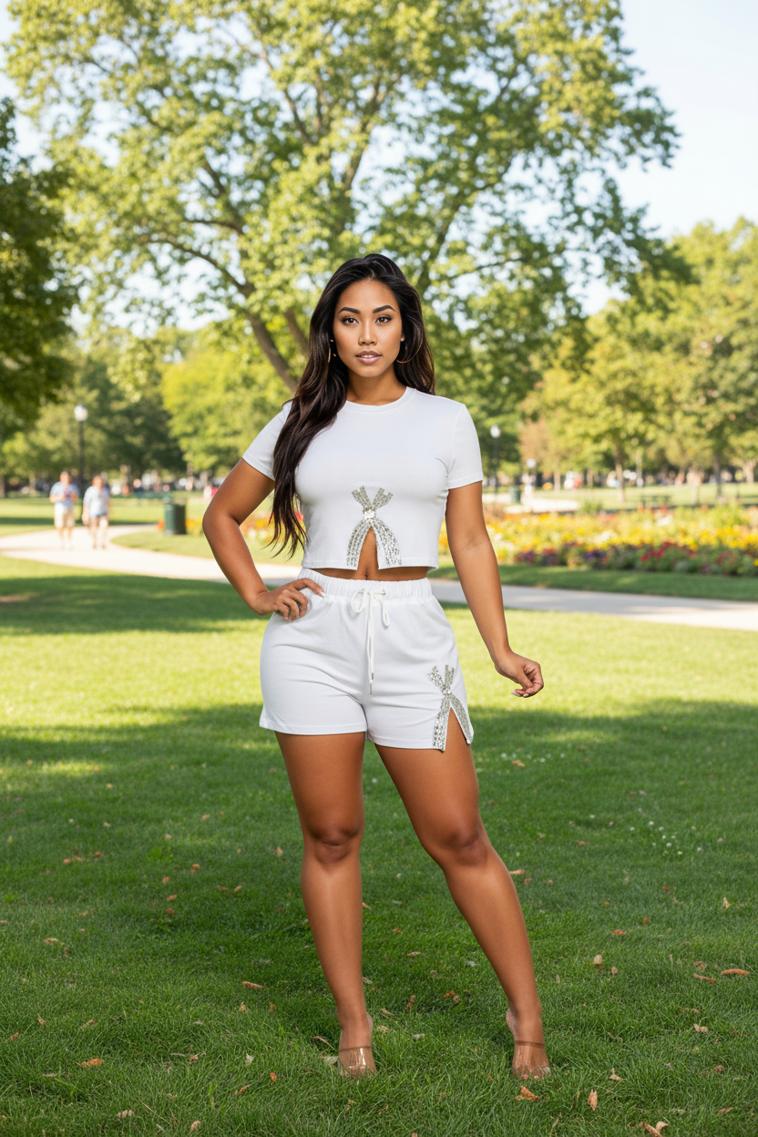 Prepare to turn heads with our WHITE DIAMOND SETS! Featuring comfortable shorts and matching top Embellished with Rhinestones. These two-piece sets are both stylish and practical. Made with stretchy, non-see through material available in 3 sizes, you'll be ready for any outing in comfort and confidence!